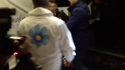 Sverigedemokraternas partiledare, jimmie åkesson, fick en tårta upptryckt i ansiktet på nytorget på södermalm i stockholm.